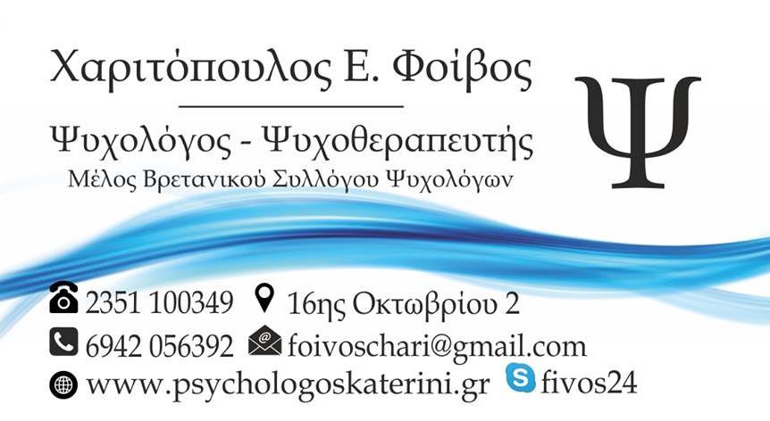 Ιδιώτης Ψυχολόγος στην Κατερίνη. Κάτοχος άδειας άσκησης επαγγέλματος στην Ψυχολογία και την Νοσηλευτική για Άτομα με Ψυχικές Παθήσεις (ΔΕ).