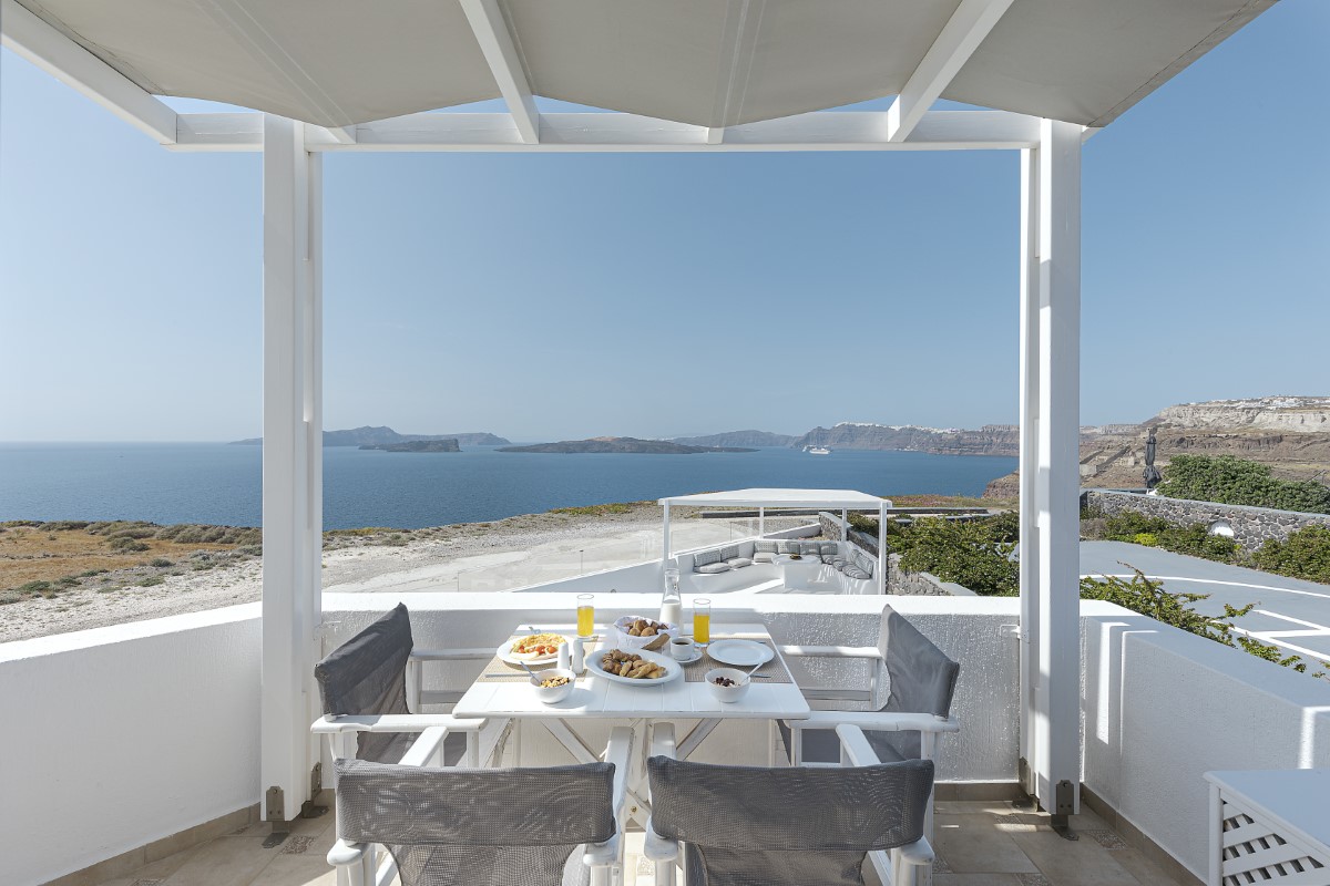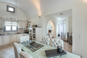 With a hosting capacity of up to 6 persons, it is a self-catering villa with 3 soundproof, non-smoking bedrooms, a WC, and a full-fledged bathroom equipped with free toiletries and various towels, air-conditioning, free wi-fi throughout the estate, and a roomy kitchen with refrigeration and small appliances. Adding to that, a spacious living room with a built-in fireplace is present, as well as flat-screen TVs and a writing desk. The whitewashed verandas and balconies offer a charming variety of island views; from the pristine swimming pool outside the villa and the lovely vineyard on the back of the estate to the azure Aegean Sea and the famous Caldera and Volcano vistas.