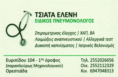 Πλήρης Σπιρομετρικός έλεγχος, Αλλεργικά τέστ, Διακοπή καπνίσματος, Ιατρικός Βελονισμός.Πρωί καθημερινά: 09:00-13:30Απόγευμα: Δευτέρα - Τρίτη - Πέμπτη 18:00-20:30